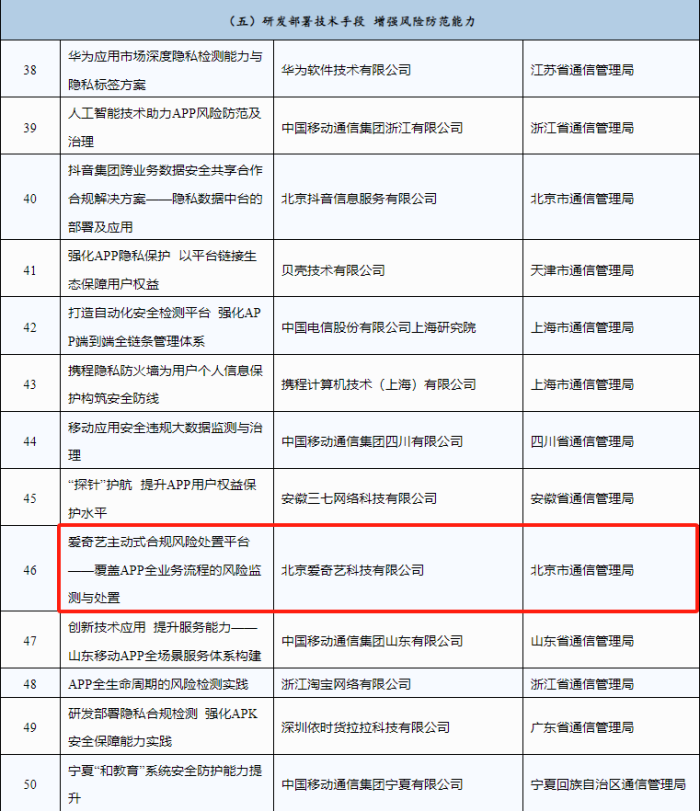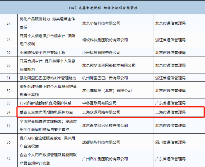 2024年1月,工业和信息化部通信管理局公布2023年移动互联网应用服务能力提升优秀案例名单。“爱奇艺主动式合规风险处置平台——覆盖APP全业务流程的风险监测与处置”“爱奇艺全生命周期隐私保护方案”,分别入选“完善制度规程,加强全流程合规管理”和“研发部署技术手段,增强风险防范能力”领域优秀案例。