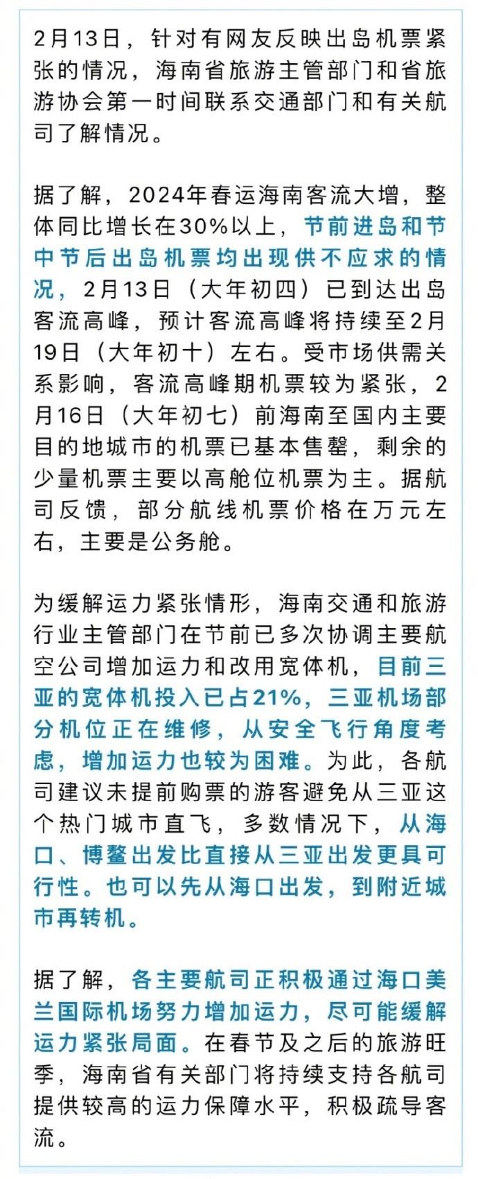 近日,有网友反映海南出岛机票紧张,有的航线只剩一万多元的机票可选。对此,海南省旅游主管部门表示,2024年春运,海南客流整体同比增长30%以上;目前三亚的宽体机投入已占21%,三亚机场部分机位正在维修,增加运力较困难。各航司建议未提前购票的游客避免从三亚直飞,可从海口、博鳌出发,或到附近城市转机。