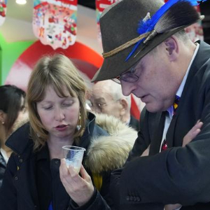 2月21日,德国企业代表在到访宁夏期间品尝贺兰山东麓葡萄酒。新华社记者 刘海 摄