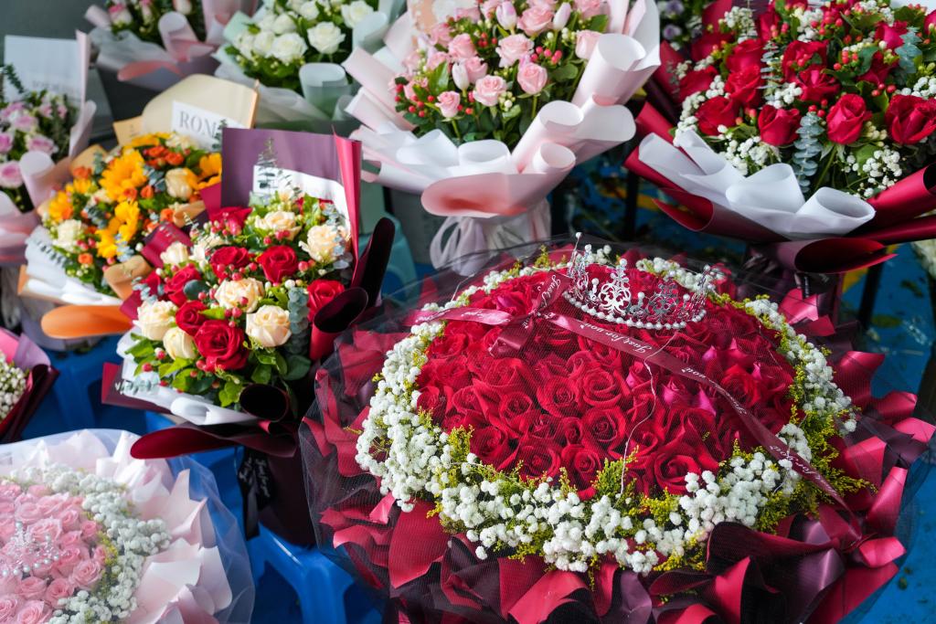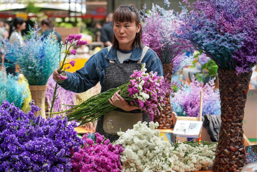 5月15日,商家在昆明斗南花卉交易市场里销售花束。新华社记者 王静颐 摄