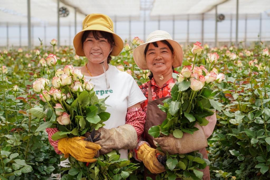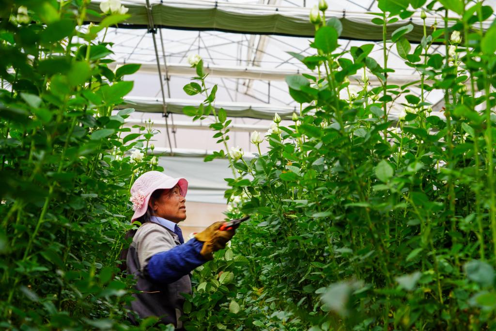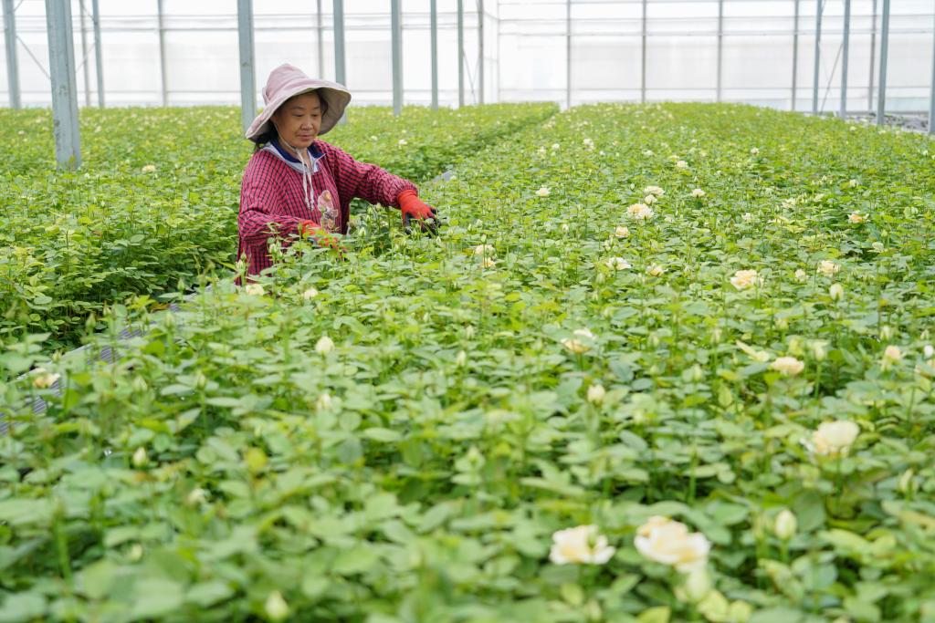 5月15日,花农韩美仙在景都花卉种植基地里采收玫瑰花。新华社记者 王静颐 摄
