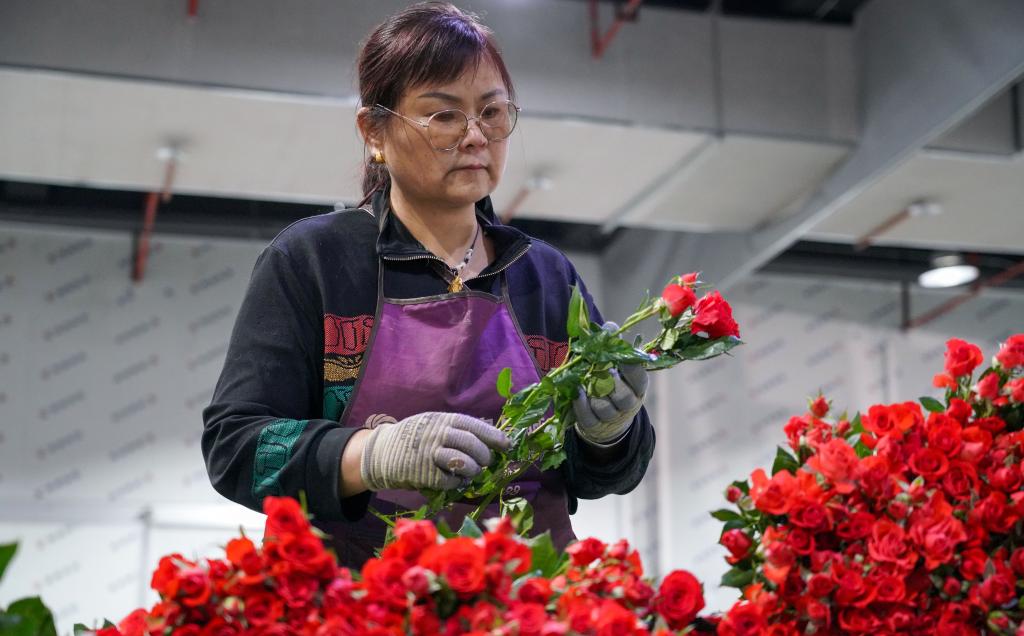 5月15日,工作人员在晋宁区国际花卉综合物流中心里打包鲜切花。新华社记者 王静颐 摄