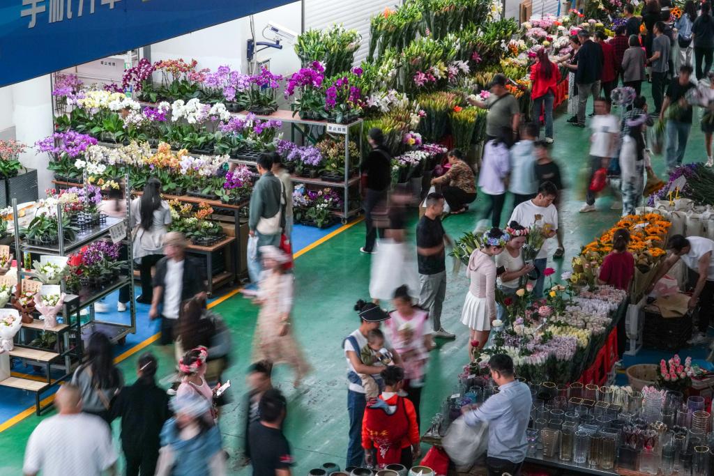 5月15日,花农在晋宁区国际花卉综合物流中心里销售鲜花。新华社记者 王静颐 摄