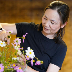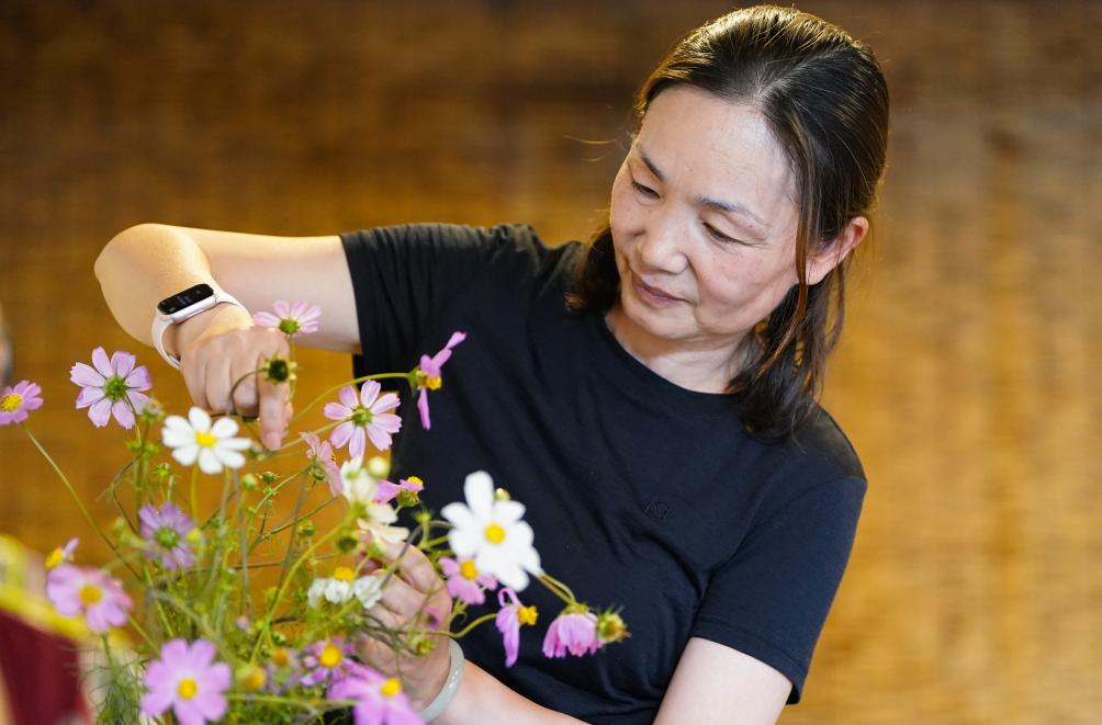 来自湖南的周女士在位于土瓜冲村的旅居房内打理采摘的野花(9月15日摄)。新华社记者陈欣波 摄