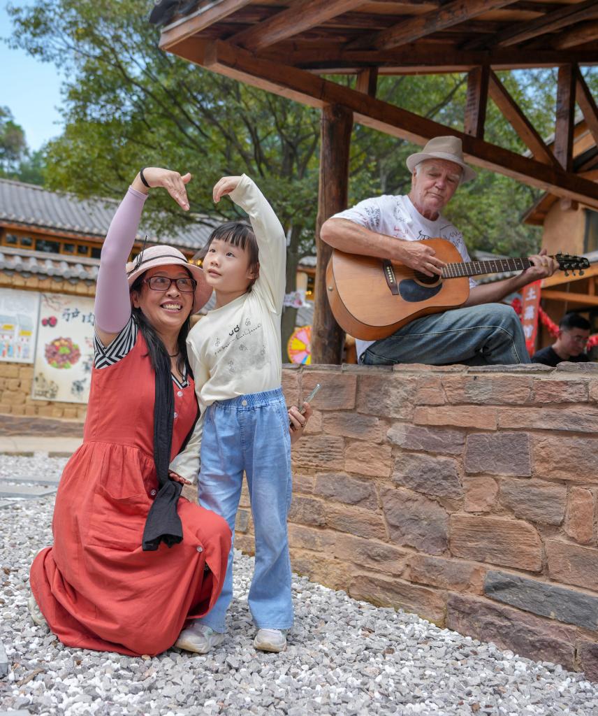 王伶(左)和一名小朋友在土瓜冲村合影,她的爱人在一旁弹吉他(9月15日摄)。新华社记者陈欣波 摄