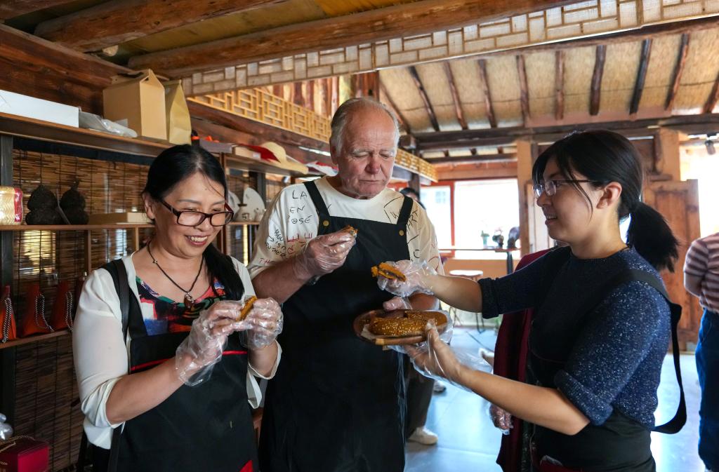 袁云(右)在自己的烘焙店内向王伶(左)和她的爱人(中)分享店铺制作的中秋月饼(9月15日摄)。新华社记者陈欣波 摄