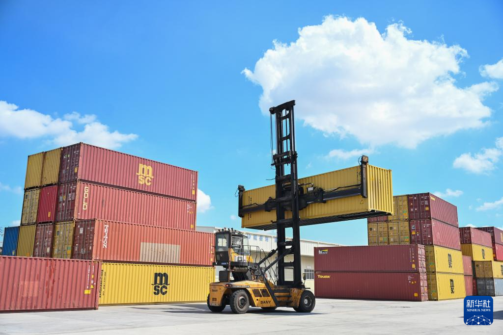 在晋江陆地港的国际陆港口岸海关监管堆场,港口集装箱吊运机在作业(2022年9月27日摄)。新华社记者 周义 摄