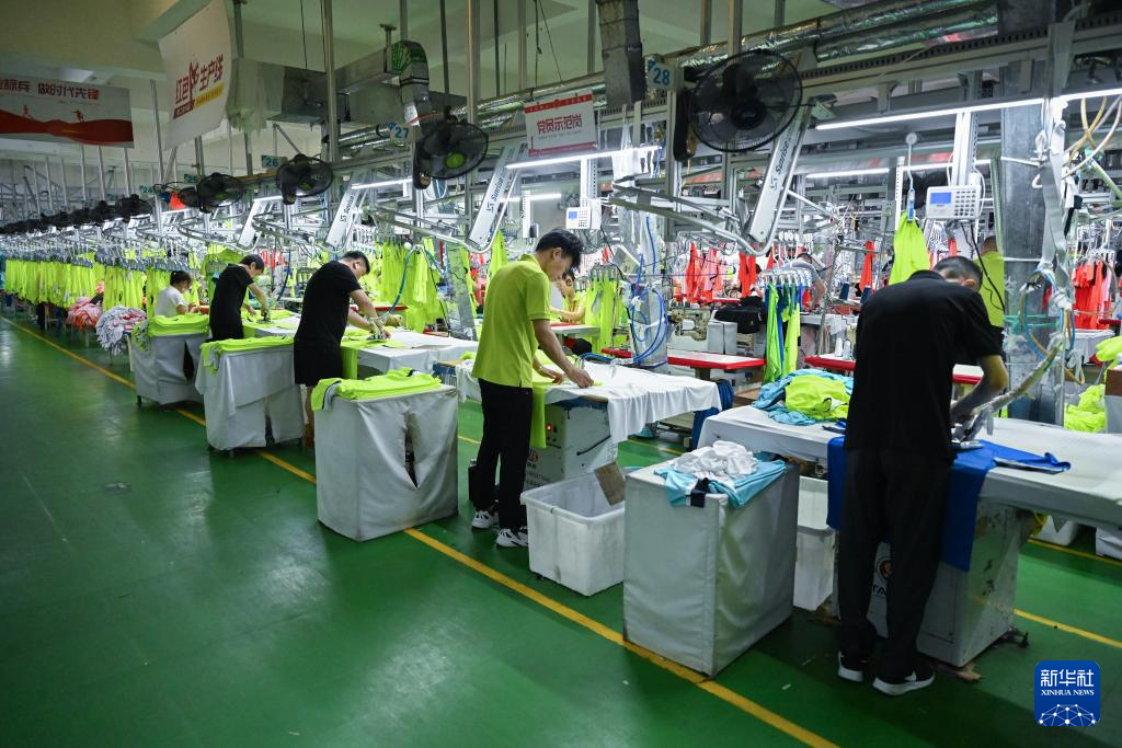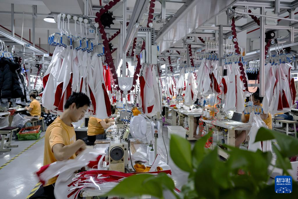 在晋江卡尔美体育用品有限公司服装生产车间,工人在赶制订单(2022年5月13日摄)。新华社记者 周义 摄