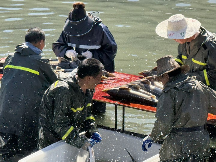 开县泰旭农业综合开发有限公司冷水鱼养殖基地中,工作人员正在检验鲟鱼生长情况。新华社记者李晓婷 摄