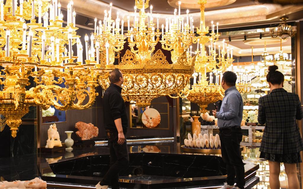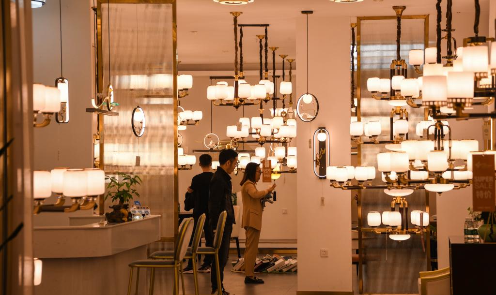 顾客在古镇灯饰卖场内挑选灯具产品。新华社发