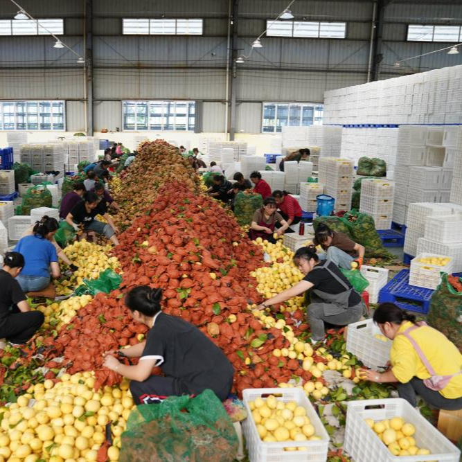 安岳县一企业车间内等待被分拣的柠檬。新华社记者 胥冰洁 摄