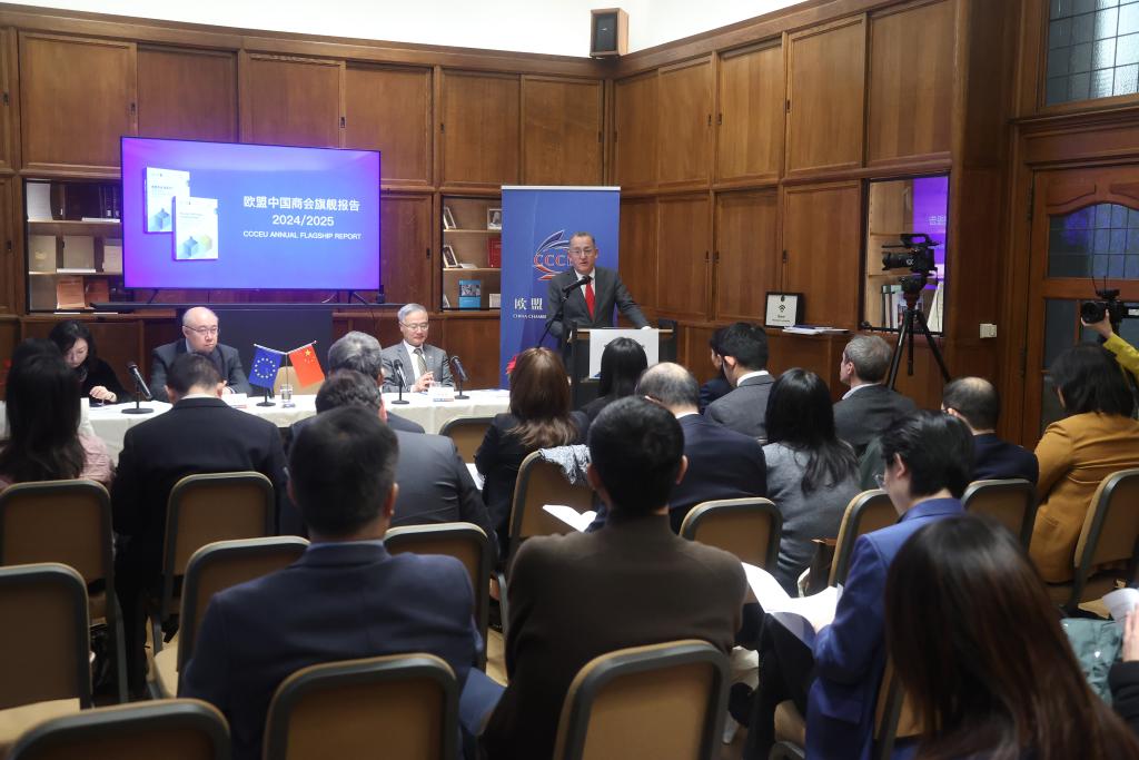 12月9日,在比利时首都布鲁塞尔,欧盟中国商会与咨询公司罗兰贝格共同发布2024至2025年度旗舰报告。新华社记者赵丁喆摄