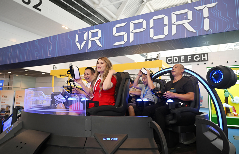 与会中外嘉宾在2024中国文化旅游产业博览会上体验一款VR设备。新华社记者赵子硕 摄
