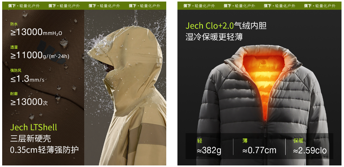 蕉下冲锋衣通过自主面料研发,在Jech LTShell轻量化新硬壳Wind Shell防风外层 、Uni-Vapor呼吸式疏水PU膜 、Heat Amass暖感亲肤里层的三层面料中使用了超轻薄细密纤维,可达到0.35cm的轻薄;而通过对自有Jech Clo+2.0气绒技术的升级,冲锋衣气绒内胆同样可达到0.77cm的轻薄。