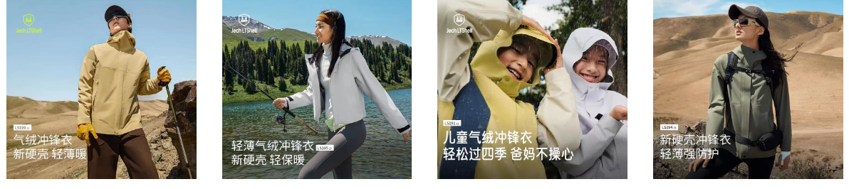 在定价上,蕉下将所有的硬壳冲锋衣产品,从单冲到三合一的定价均设置在百元价格带,低于市面上大部分硬壳同类产品;在户外防护功能上,蕉下在冲锋衣产品上集中运用了自有AntiTec防护科技和Jech Clo+2.0等技术,做到了“从户外防护功能,到工艺细节、人性化设计,媲美千元价位以上的专业户外同类产品”。