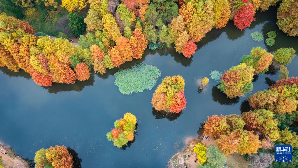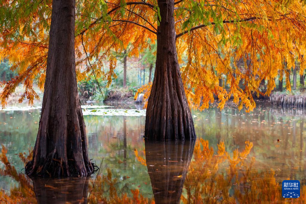 初冬时节,南京明孝陵景区燕雀湖畔的杉树林色彩斑斓,美如画卷。