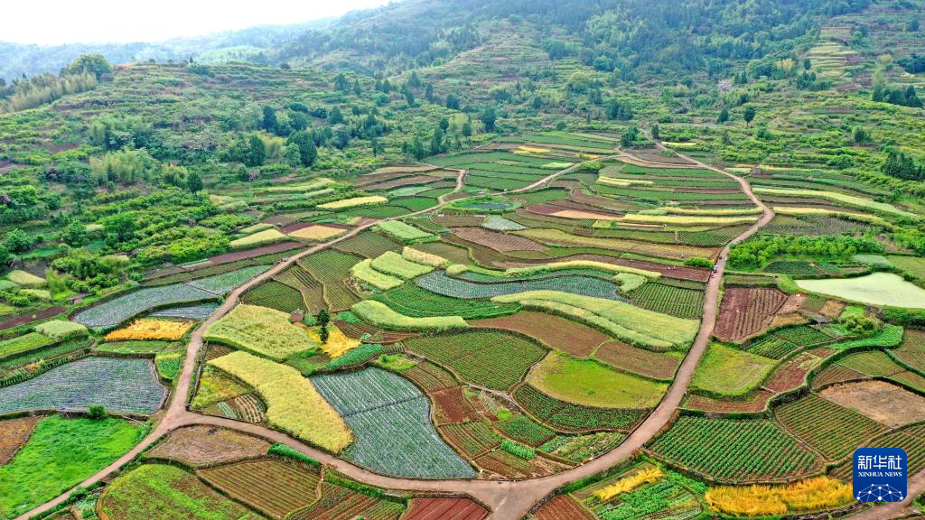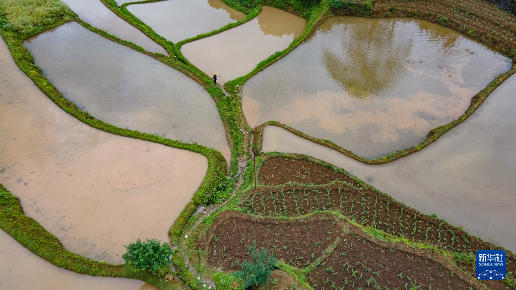 5月6日,在重庆市秀山土家族苗族自治县洪安镇美其村,村民在田间行走(无人机照片)。