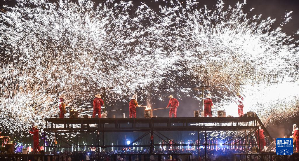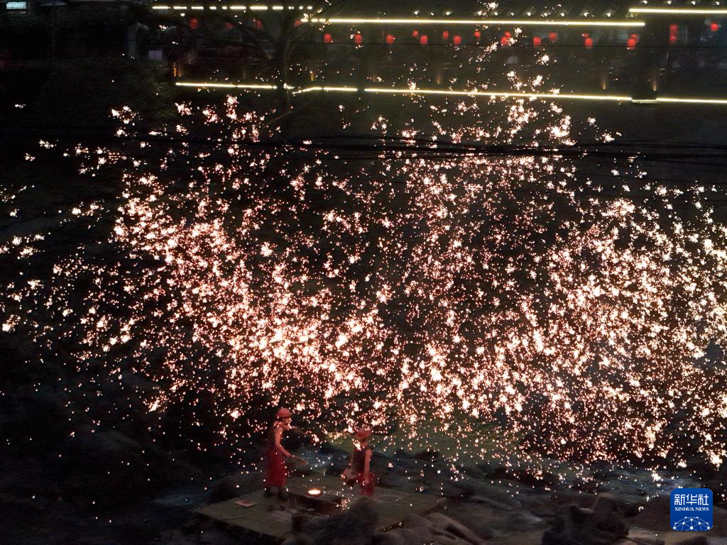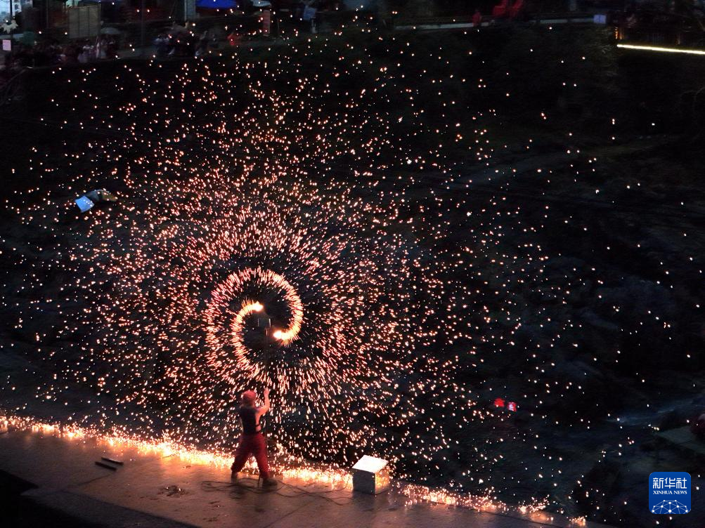 当晚,河南省洛阳市2024隋唐河洛文化庙会举行的非遗技艺打铁花表演现场火花飞溅,闪耀夜空,吸引游人驻足观赏。