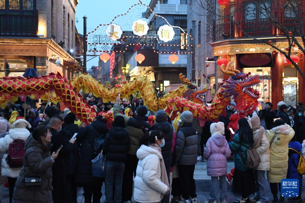 游客在前门大街观看舞龙表演(2月2日摄)。