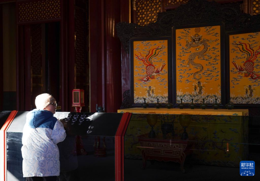 一名小朋友在景山寿皇殿内云龙插屏前(1月23日)。