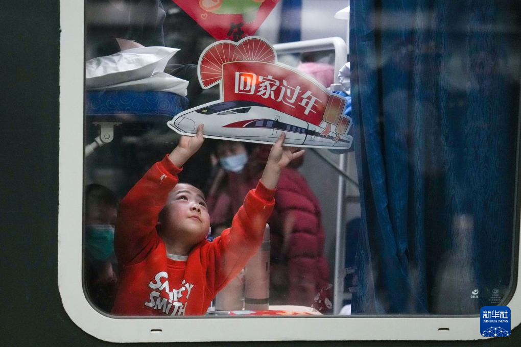 1月13日,在北京地区春运首趟旅客列车K4159次发车前,一名小乘客拿着“回家过年”的标牌在车厢内玩耍。