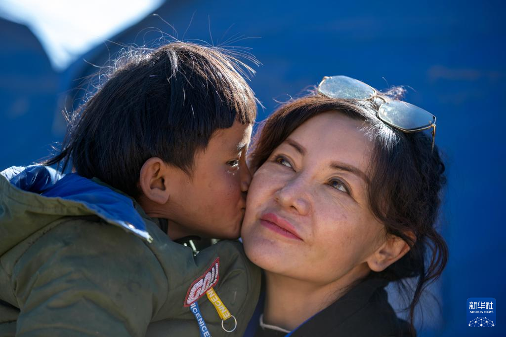1月11日,在定日县曲洛乡措昂村的受灾群众安置点,一名女孩亲吻中国科学院心理研究所应急心理救援队的专家谭惜仁(右)。