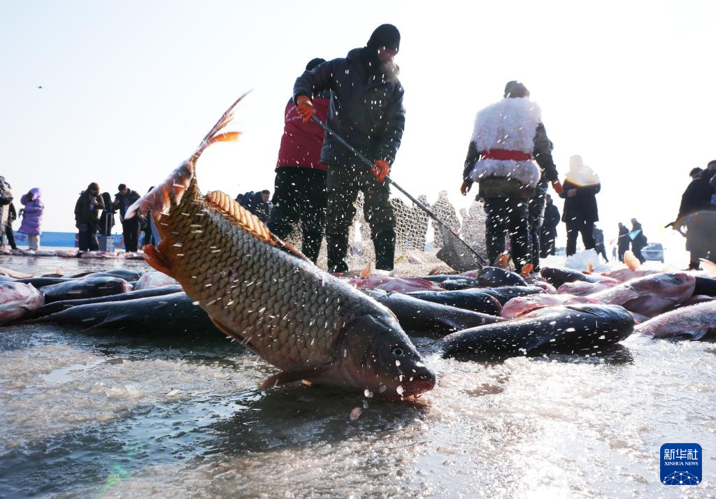这是1月11日在沈阳康平卧龙湖拍摄的冬捕出鱼现场。