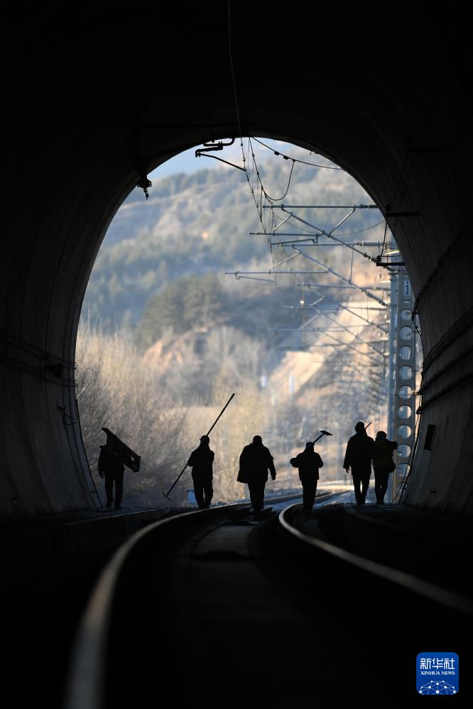 中国铁路太原局集团有限公司太原南工务段吕梁山隧道打冰队队员行走在隧道内准备除冰(1月9日摄)。