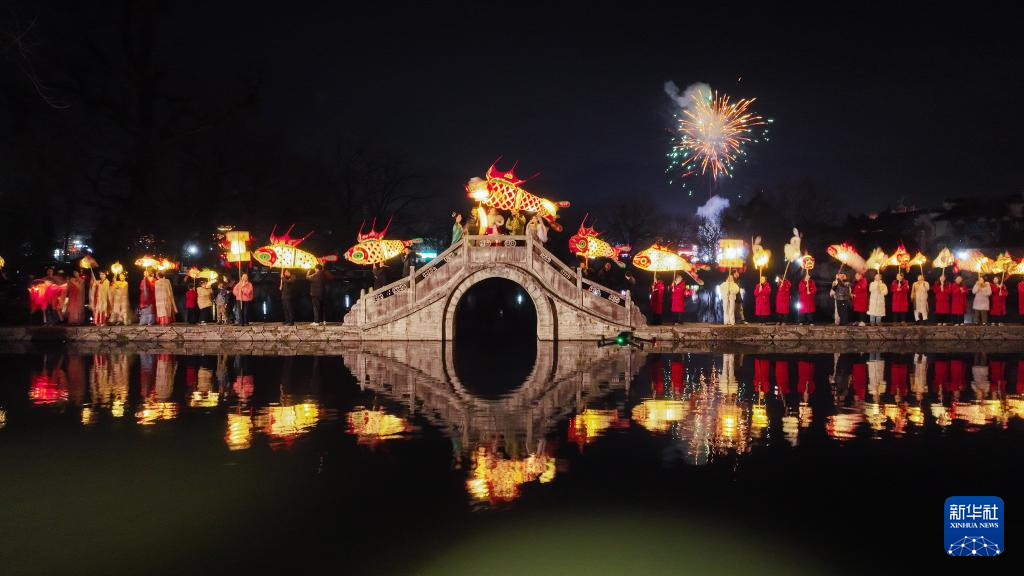 2月11日晚,花灯表演队在安徽省黄山市黟县宏村巡游。