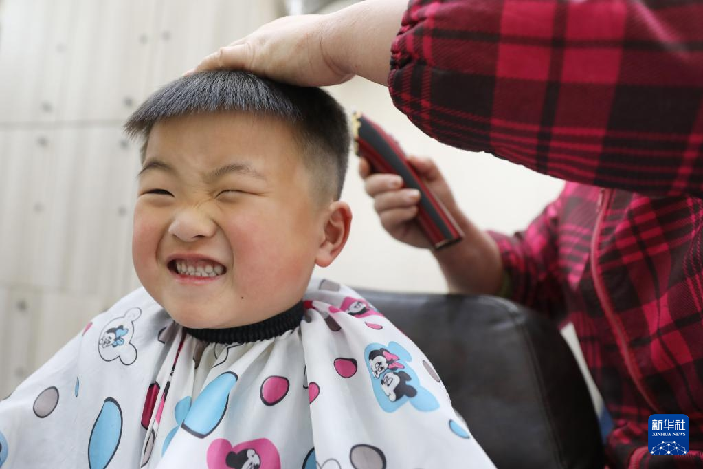 3月1日,一名小朋友在河南省焦作市温县一家理发店理发。
