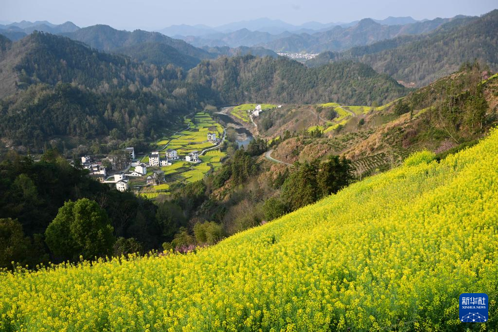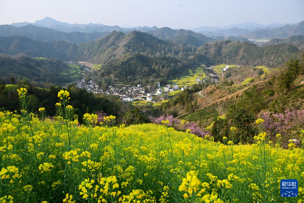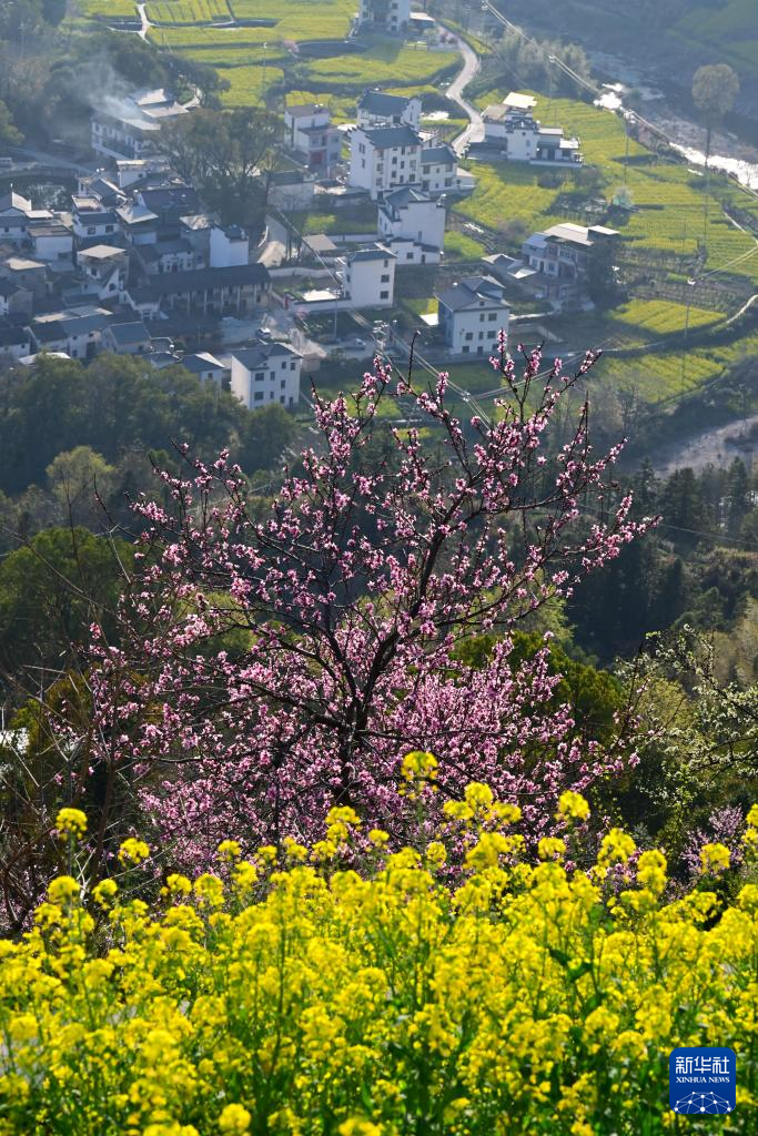 春日时节,在安徽省黄山市歙县霞坑镇石潭村,漫山遍野的油菜花和桃花等肆意绽放,和山川、民居相映成趣,浓浓春意吸引众多游客前来春游赏花。