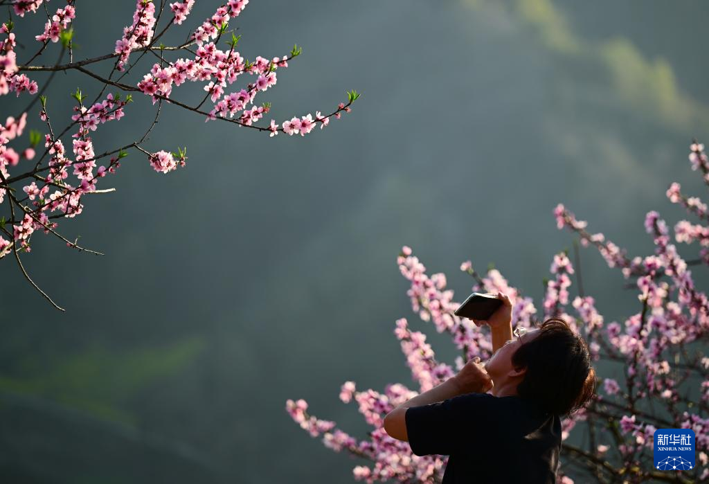 3月25日,游客在安徽省黄山市歙县霞坑镇石潭村春游赏花。