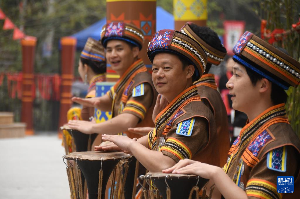 3月28日,在广西来宾市金秀瑶族自治县,人们在击打黄泥鼓。