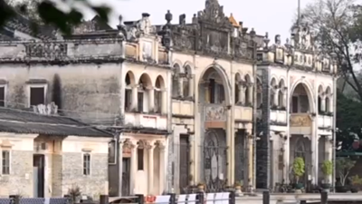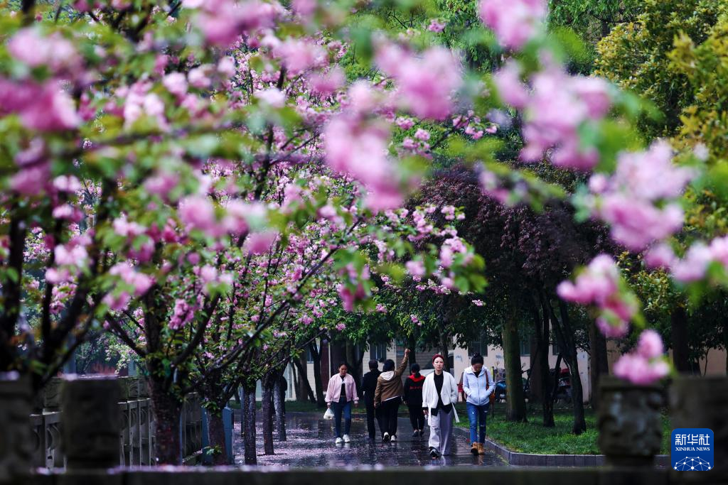 4月11日,市民走在重庆市黔江区河滨公园晚樱掩映的步道上。