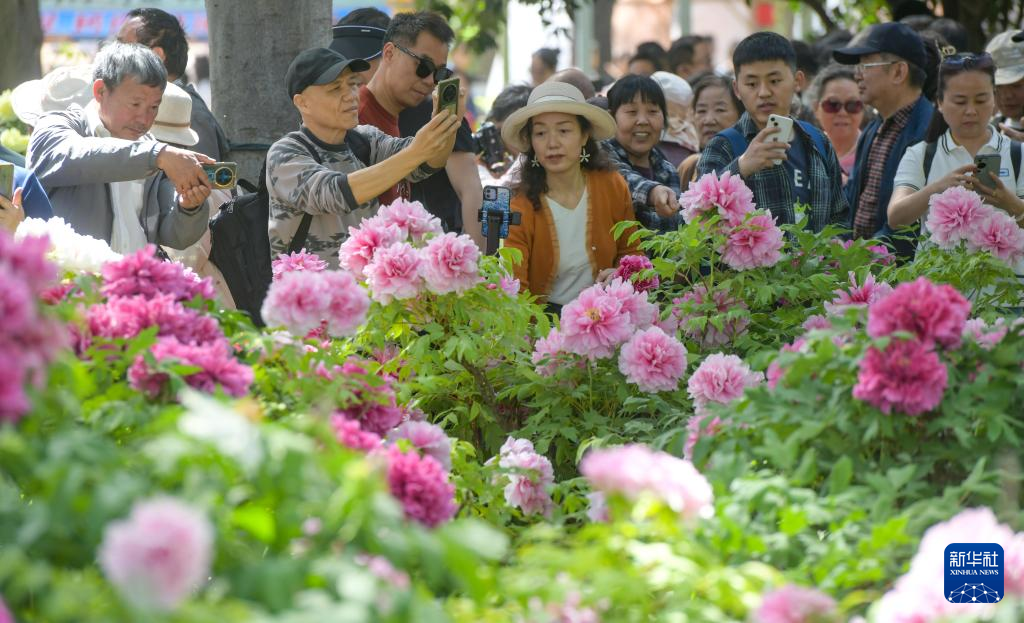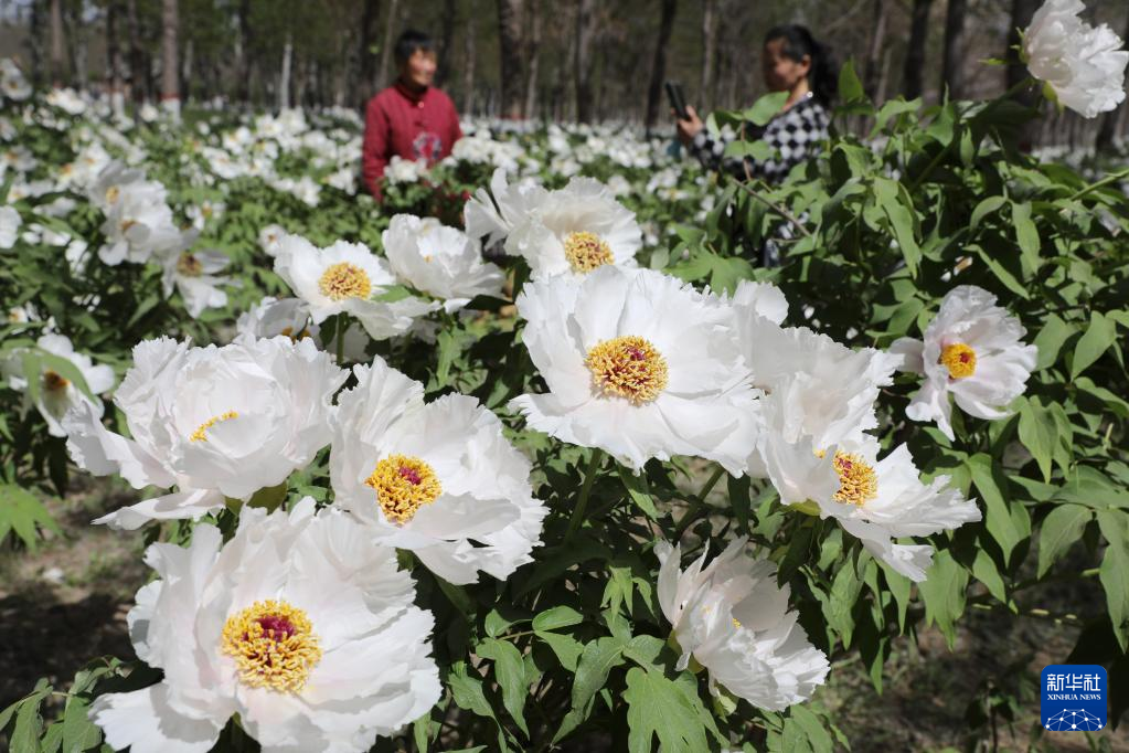 4月13日,游客在河南省焦作市温县国有实验林场芍药花海中赏花拍照。
