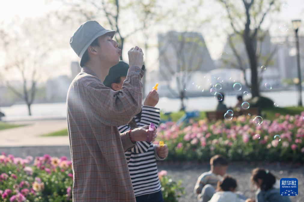 4月13日,人们在上海前滩休闲公园休闲娱乐。