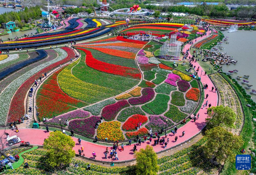 4月13日,游客在江苏省盐城市大丰区荷兰花海景区内赏花游玩(无人机照片)。