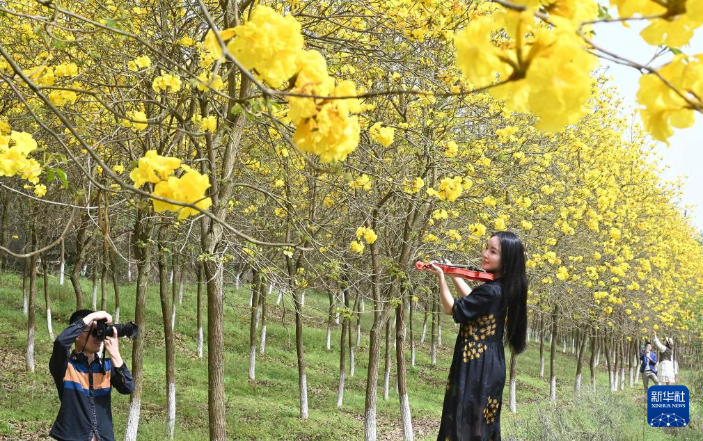 4月13日,游客在四川省内江市东兴区郭北镇南岸社区连片的黄花风铃木树下拍照。