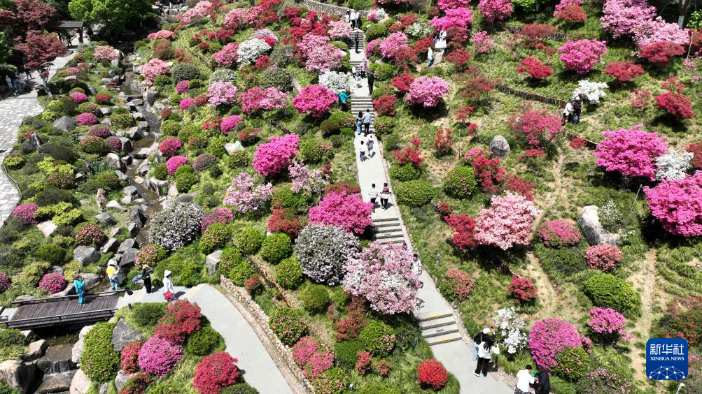 4月13日,游客在浙江省湖州市德清县下渚湖奇幻谷杜鹃花海中漫步游玩(无人机照片)。