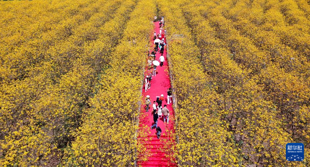 4月13日,游客在四川省眉山市东坡区多悦镇东风村成片的黄花风铃木花丛中游玩(无人机照片)。