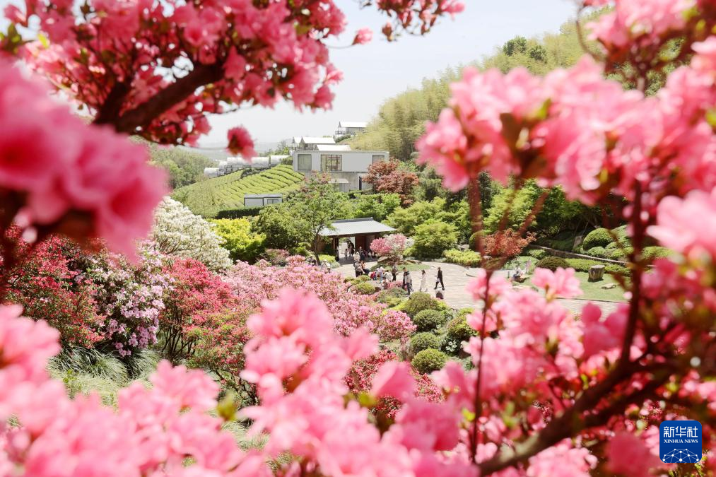 4月13日,游客在浙江省湖州市德清县下渚湖奇幻谷杜鹃花海中漫步游玩。