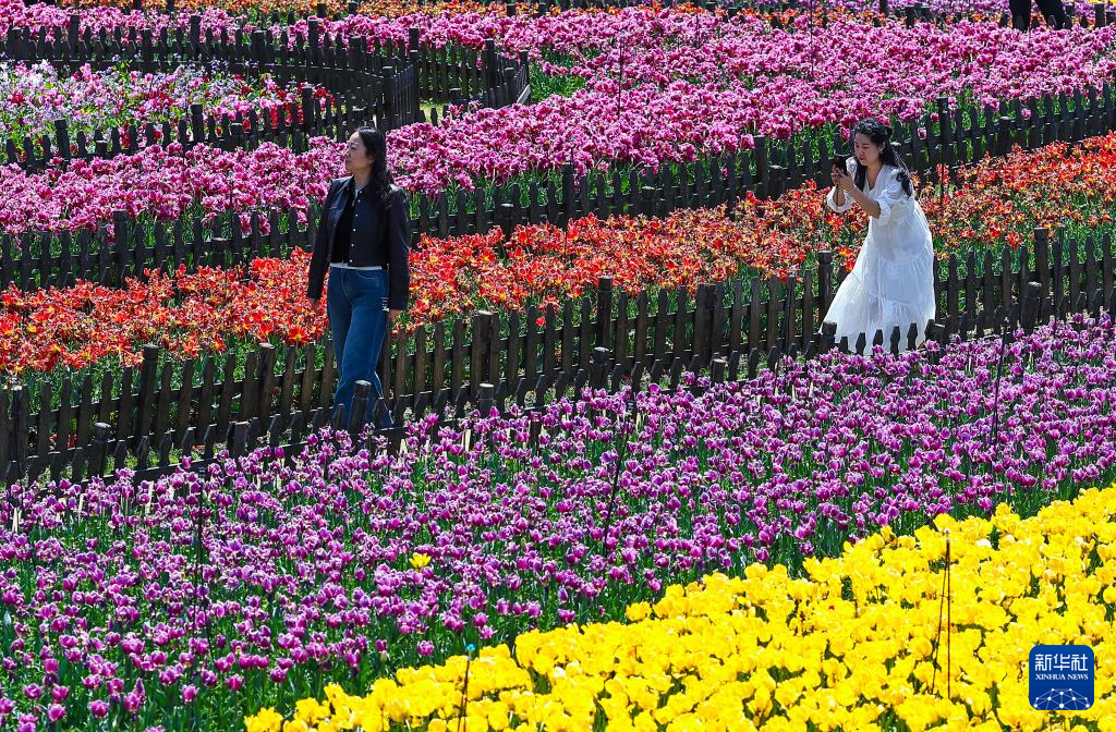 4月13日,游客在江苏省盐城市大丰区荷兰花海景区内赏花游玩。