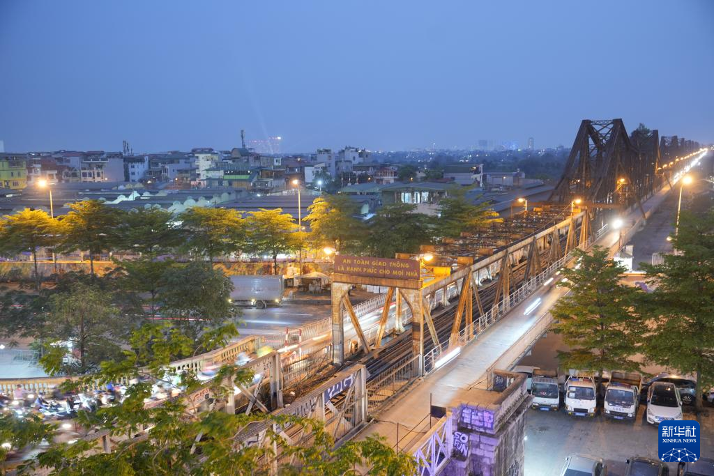 这是4月9日在越南首都河内拍摄的横跨红河、历史悠久的龙编桥。