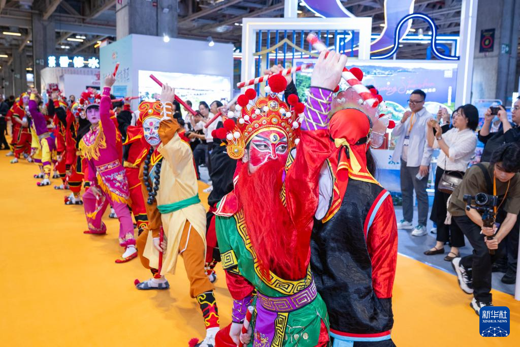4月25日,演员在第十三届澳门国际旅游(产业)博览会广东馆前表演英歌舞。新华社发(张金加摄)