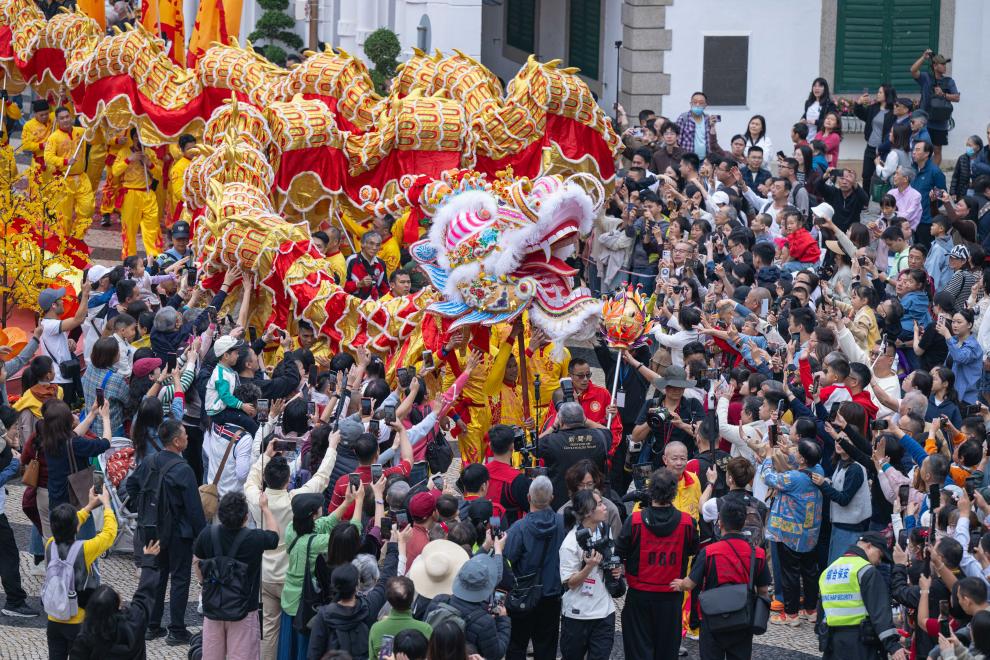 早春时节,暖意融融。澳门大三巴牌坊前,“财神”和“金童玉女”热情招呼着翘首以盼的路人,送上丙午马年的祝福。一旁,一条长逾230米的金色“巨龙”正蓄势待发。