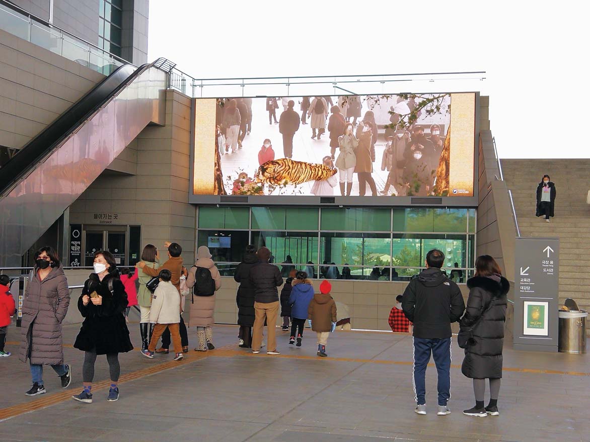 韩国国立中央博物馆门口大型AR 屏幕上的老虎吸引市民驻足