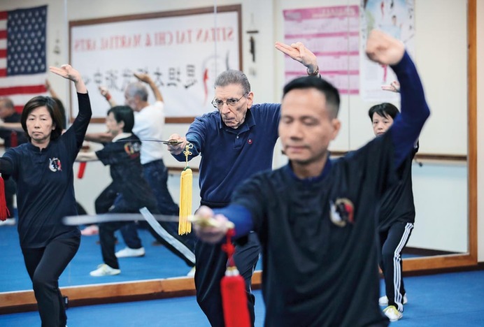 图为2019年11月20日,陈思坦在思坦太极武术中心带学员练习太极剑