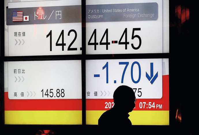2022年9月22日,在日本东京,行人从一块显示日元对美元汇率的屏幕前走过