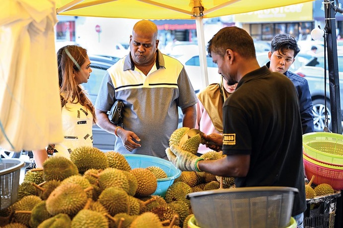 6月11日,在马来西亚吉隆坡附近的SS2“榴莲街”,一位摊主为顾客开榴莲
