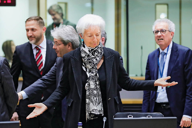 5月15日,在比利时布鲁塞尔,欧洲中央银行行长拉加德(前)出席欧元集团会议